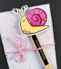 - Schnecke mit Memento stempeln und mit Stampin‘ Blends Alkoholmarkern colorieren. Tipp: Ich habe nicht das ganze Schneckenmotiv gestempelt. Dazu solltest du nur die Stellen des Stempels einfärben, die du auch stempeln möchtest. Du kannst z.B. ein Post-It auf den Stempel kleben und dann das Memento Stempelkissen benutzen. Alternativ geht auch der schwarze Stampin‘ Write Marker oder ein Memento-Stift, mit dem du nur die druckenden Stellen färbst.